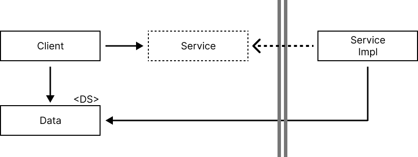dependency inversion이 적용되면 flow of control은 client가 service interface를 통해 low level인 ServiceImpl을 호출한다. 그러나 boundary에서 dependency는 이와 반대로, low level에서 high level로 depend한다. 이 때, 호출하는 쪽에 Data 정의가 위치한다.