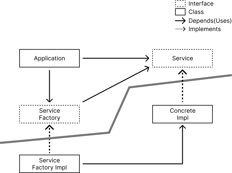application은 ConcreteImpl을 사용하기 위해 Service interface를 사용한다. 이 때 어떻게든 ConcreteImpl을 생성해야 하는데, 직접 생성한다면 ConcreteImpl에 dependency를 가지게 된다. Dependency Inversion Principle 위반이다. 따라서 ServiceFactory interface를 만든다. ServiceFactory는 Service type으로 무언가를 리턴해 주며, 이를 구현하는 ServiceFactoryImpl에서 ConcreteImpl을 생성한 후 ConcreteImpl을 Service type으로 리턴한다.
