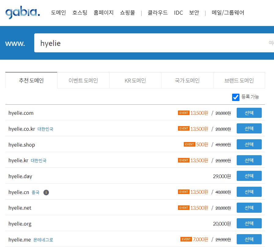 gabia를 선택한 이유는 국내에서 활발하게 거래가 이루어지는 사이트이며, 상당히 저렴한 가격에 도메인을 팔고 있기 때문이다. .com이나 .co.kr, .kr과 같이 유명한 도메인들도 1년에 만원 선에 팔고 있다. 심지어 .shop은 500원이다(...) 나는 마음에 들었던 hyelie.site라는 도메인을 1800원에 구매했다.
