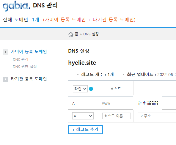 만약 host를 www로 하면 'www.hyelie.site'로 접근되며 abc로 하면 'abc.hyelie.site'로 접근되는 식이다.