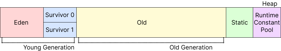 heap은 위 그림과 같이 eden 영역, survivor 영역, old 영역으로 나뉜다. 일반적으로 object는 빨리 GC의 대상이 되고, 살아남는 object는 더 오래 살아있을 가능성이 높기 때문이다.
