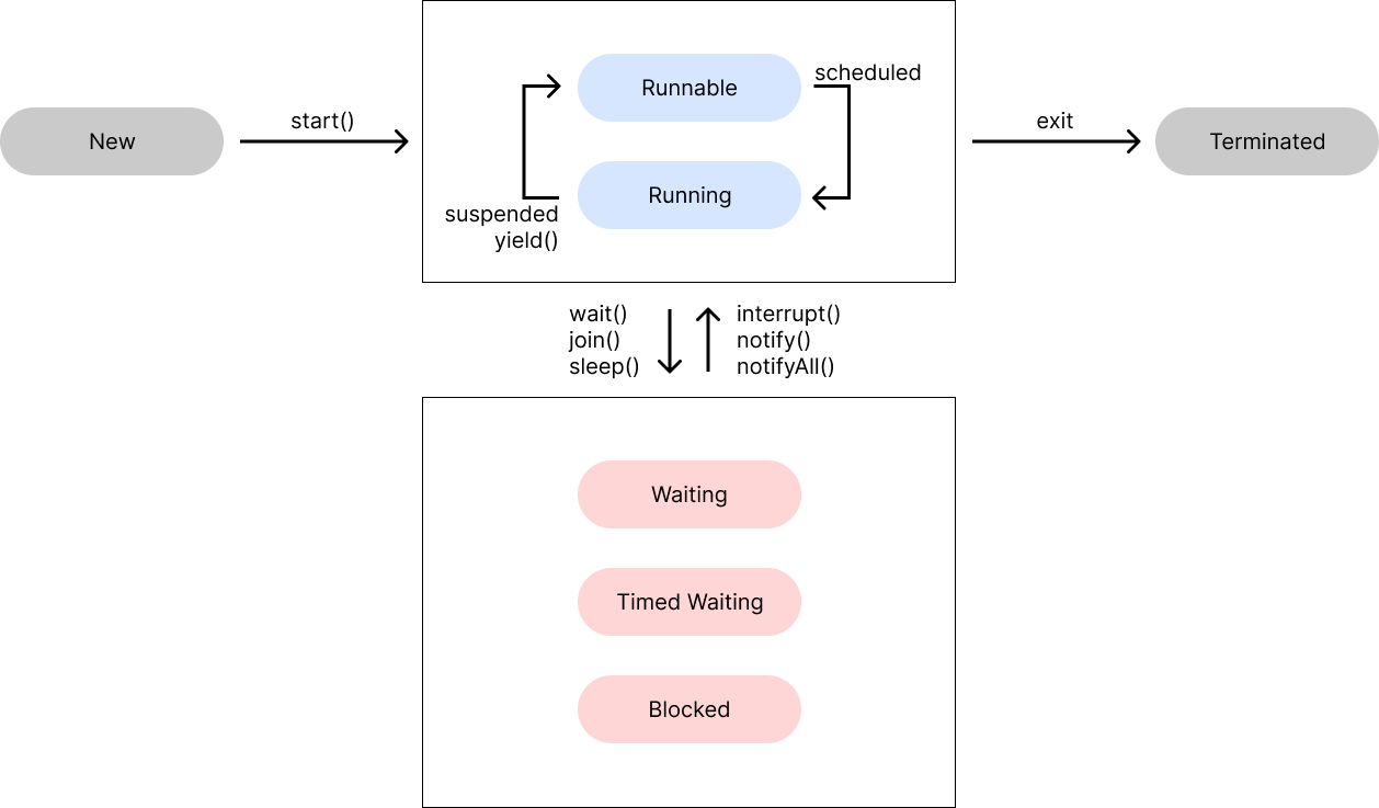 - terminated : 실행이 완료되어 정상적으로 끝났든, 오류 발생으로 비정상적으로 끝났든 thread가 작업을 종료한 상태