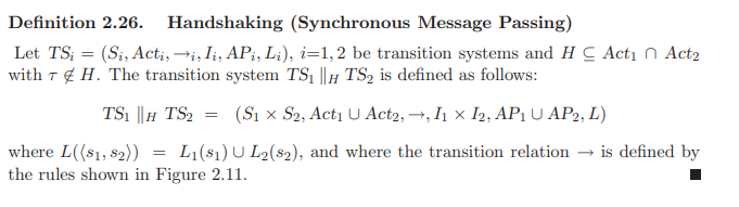 synchronous message passing (handshaking)이란 interacting하는 transition system들이 synchronous하게 특정 action을 처리해야 한다는 것을 의미한다. 즉, 2개 이상의 transition system이 동시에 특정 action을 수행해야 한다는 것이다.