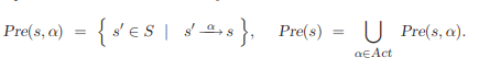 어떤 state s'에서 alpha를 통해 s로 갈 수 있을 때 Pre(s', $\alpha$) = s일 때 s'의 집합이다. Pre(s)는 모든 $\alpha$에 대해 Pre(s, $\alpha$)의 합집합이다.