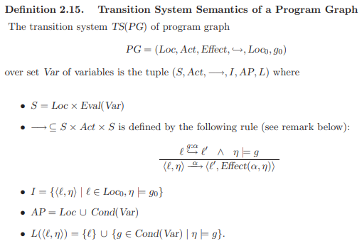 - 이 때 Transition System의 transition relation은 해당 분수식, 즉 다음 식을 만족하는 제일 작은 relation이다. - if $\text{l} \overset{g:\alpha}{\rightarrow} \text{l;}$ ∧ $\eta \models$ g then <l, $\eta$> $\overset{\alpha}{\rightarrow}$ <l', Effect($\alpha, \eta$)>