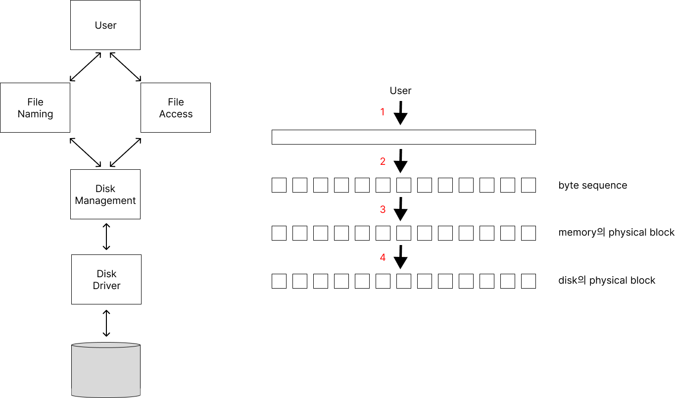 사용자가 file에 접근할 때 위와 같은 과정을 거친다. 실제로 file은 physical block의 연속이지만 file system은 byte sequence로 사용자에게 abstraction해 준다.