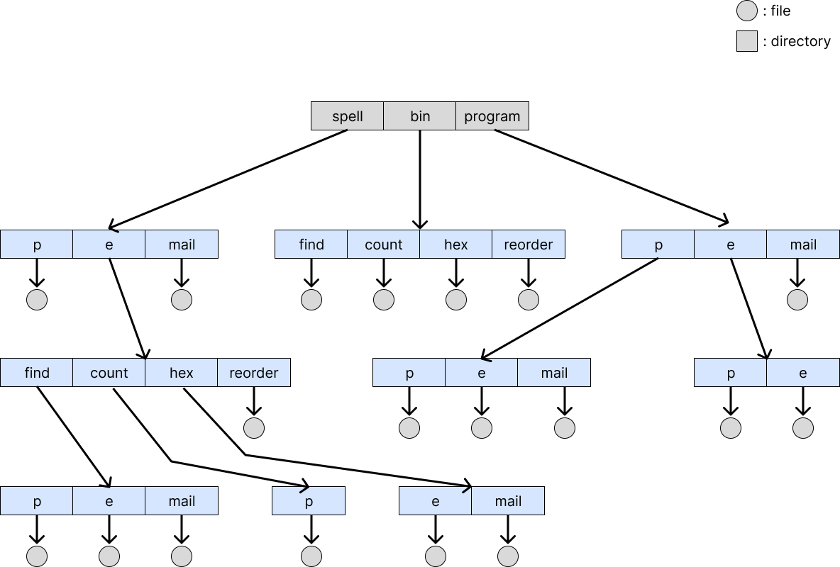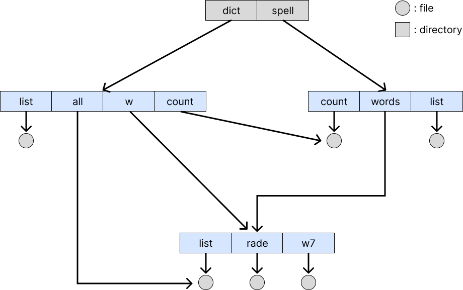 - 위그림에서 예를 들어 /dict/count와 /spell/count가 같은 file을 가리킨다.
