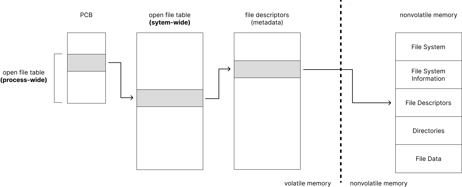 file system의 속도 향상을 위해 file descriptor(file metadata)를 memory에 올린다. 이 때 process는 metadata를 바로 쓰는 것이 아니라 open file table을 거쳐 사용한다.