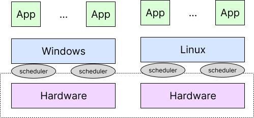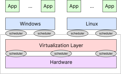그러나 오른쪽 그림처럼 OS가 virtualization된 경우를 생각해 보자. 각 OS는 자신에게 주어진 virtual CPU로 scheduling하며, virtualization layer에서 physical CPU로 scheduling한다. 총 2번의 scheduling을 하게 되는 것이다! 이러한 구조는 성능 저하를 발생시킨다.