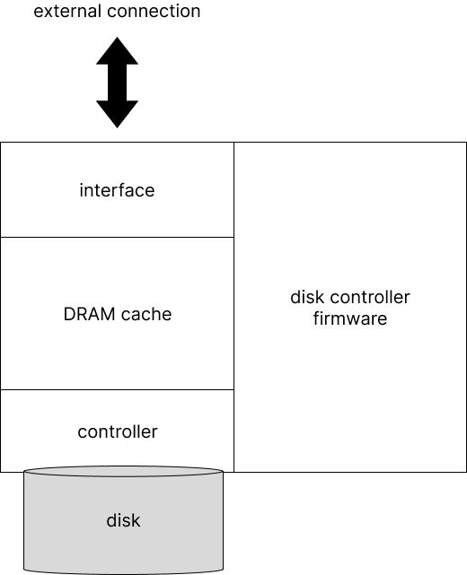 disk와 connection의 사이는 위와 같이 controller가 붙어 있다. 이 때 외부 connection은 데이터가 DRAM cache에 있는지, disk에 있는지 모른다.