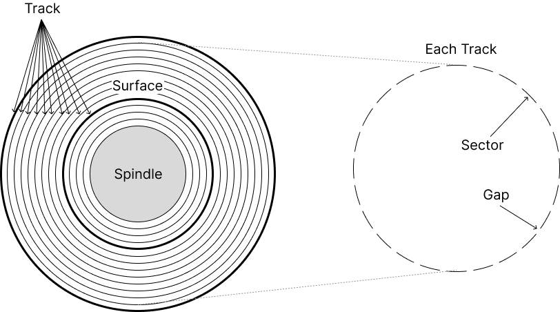 Storage - RAM & Disk 포스팅에서 surface, track, sector의 구조 그림을 그려 놨다.