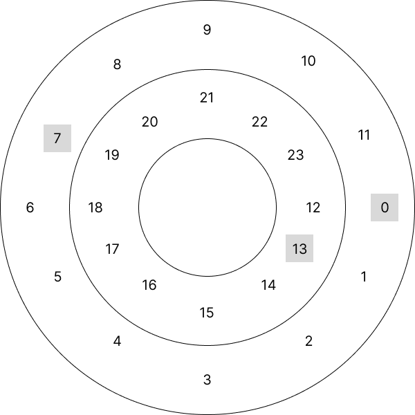 위와 같이 생긴 platter에서 0, 7, 13에 있는 sector를 읽는다고 하자. CSCAN은 같은 track에 있는 것을 우선적으로 읽기 때문에 0, 7, 13의 순서로 읽는다.