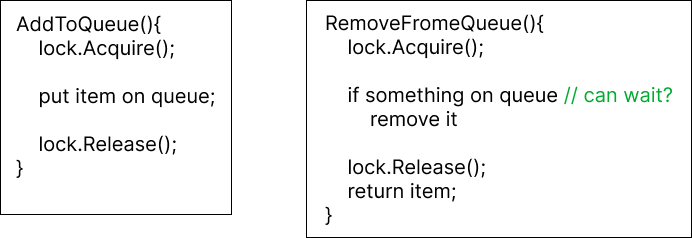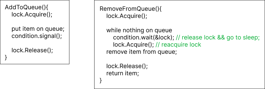 - RemoveFromeQueue()의 condition.wait()는 lock을 release하고 sleep한다. 이후 signal()에 의해 다시 깨어났을 경우 lock을 다시 acquire해야만 critical section에 접근할 수 있다는 것을 기억해야 한다.