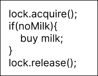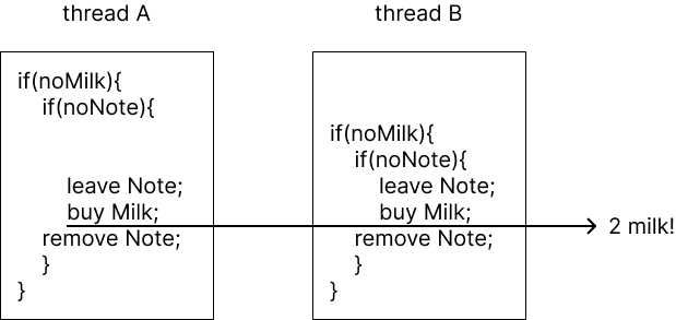 2개의 thread가 각각 우유를 하나씩 살 수 있다고 할 때, 단 하나의 우유만 사는 operation을 만들고 싶다. 어떻게 구현할까?