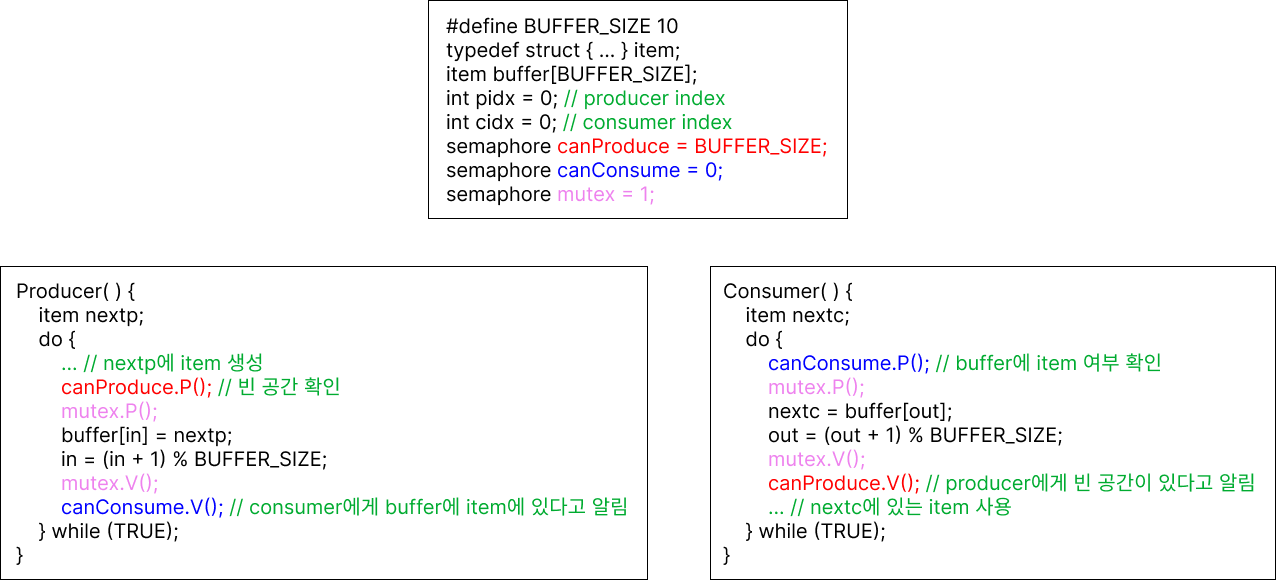 - producer는 buffer가 가득 차 있다면 consumer가 값을 사용할 때까지 기다려야 한다. scheduling constraint이므로 BUFFER_SIZE로 초기화된 canProduce semaphore를 사용한다. 0인 경우 buffer가 가득 찬 것이다.