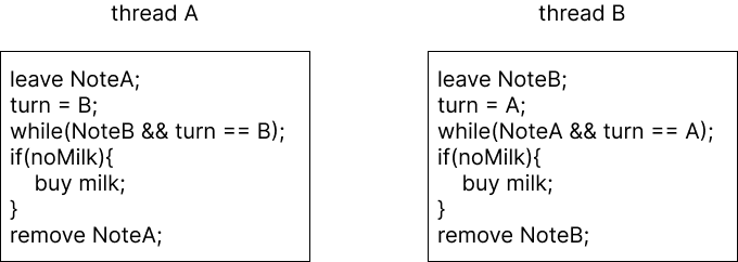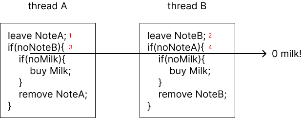 이 경우 1-2-3-4 순으로 실행되면 둘 다 우유를 사러 가지 않는 경우의 수가 존재한다. (starvation)