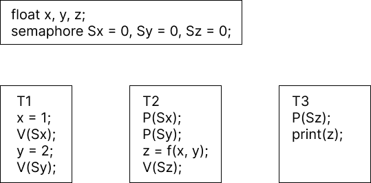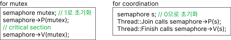 - 위에서는 thread join과 finish를 예로 든다. thread join의 경우는 thread terminate가 될 때까지 기다려야 한다. semaphore 값을 0으로 초기화하면 P()를 호출한 thread join은 V()가 호출될 때까지 기다린다. 이 때 V()는 thread terminate에서 호출한다. 따라서 thread terminate 이후 thread join이 호출되는 것을 보장한다.