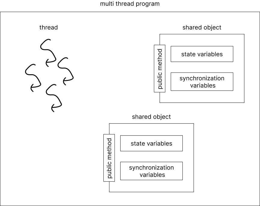 이러한 방법에서 multi thread program을 thread와 shared object로 나눌 수 있으며, shared object의 구현을 위해 detail인 state variable과 synchronization variable을 숨기고 깔끔한 public interface method를 제공하게 만들 것이다.