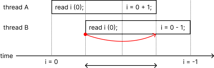 위 예시를 보자. thread A는 i++을 하고, thread B는 i--를 한다. 실행 순서가 왼쪽 그림처럼 될 경우 thread A가 실행 도중 thread B의 read i가 실행되어 thread B는 i가 0인 것으로 받아들이고 i의 결과는 -1이 된다. 그러나 실행 순서가 오른쪽 그림처럼 thread A의 실행이 끝난 후 thread B가 실행되면 i의 결과는 0이 된다. 이렇듯 shared data에 동시에 접근하고, 접근/조작의 순서에 따라 다른 결과가 나올 수 있기 때문에 이 상태는 race condition에 있는 상태다.