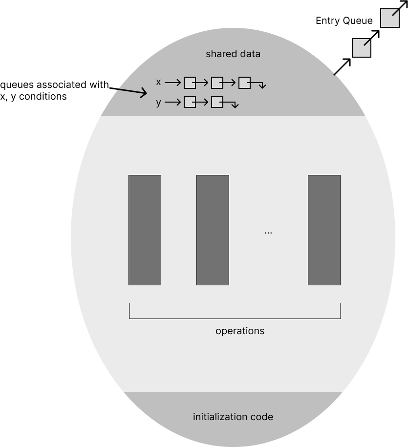 monitor는 위 그림과 같이 shared data, condition variables, operations, initialization code, entry queue(lock queue)로 이루어져 있다. 이 때 signal()로 다른 thread를 깨울 때 내부적으로 prioirty를 두어 해당 순위가 높은 것을 깨운다.