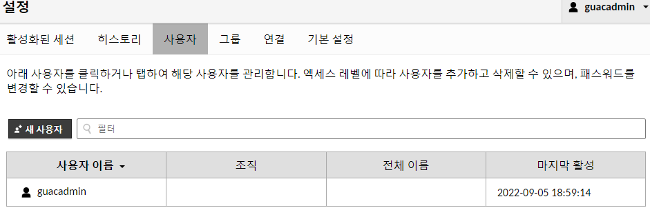기본 ID/PW는 guacadmin, guacadmin이다.